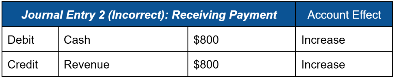 Something feels off when comparing the financial statements to reality after this mistake. I do have $800 in the bank, so that’s okay. But there’s also an $800 Accounts Receivable asset on the balance sheet. If I went to the client and asked for another $800 for the services they already paid for, I’d be in for a one-star review!