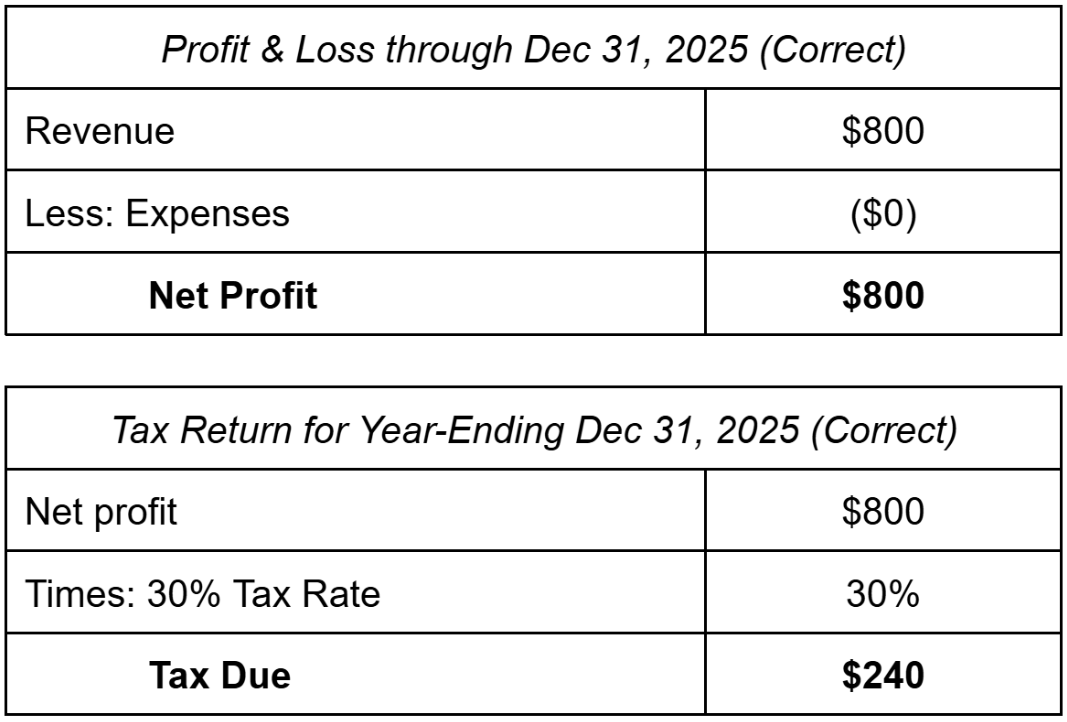 And what about the tax bill? Based on $1,600 of revenue and a presumed tax rate of 30%, my income tax due would be $480. But, in real life I only did $800 of work and collected $800 of cash. That extra $800 of “income” exists only in the bookkeeping system, but the IRS does not know that! After I pay $480 of tax from my $800 bank balance, I will only have $320 left in the account to reinvest in my business. Between the correct and incorrect scenarios, there was the same business activity, the same client, and the same $800 payment. The only difference was I paid twice as much tax!
