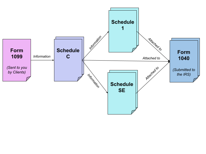 The income or loss calculated on Schedule C is carried over to Schedule 1 and Schedule SE and their results are finally entered on the first page of the Form 1040. Check out the last question in this post to see a simplified visual of how this information flows through the schedules in a tax return.